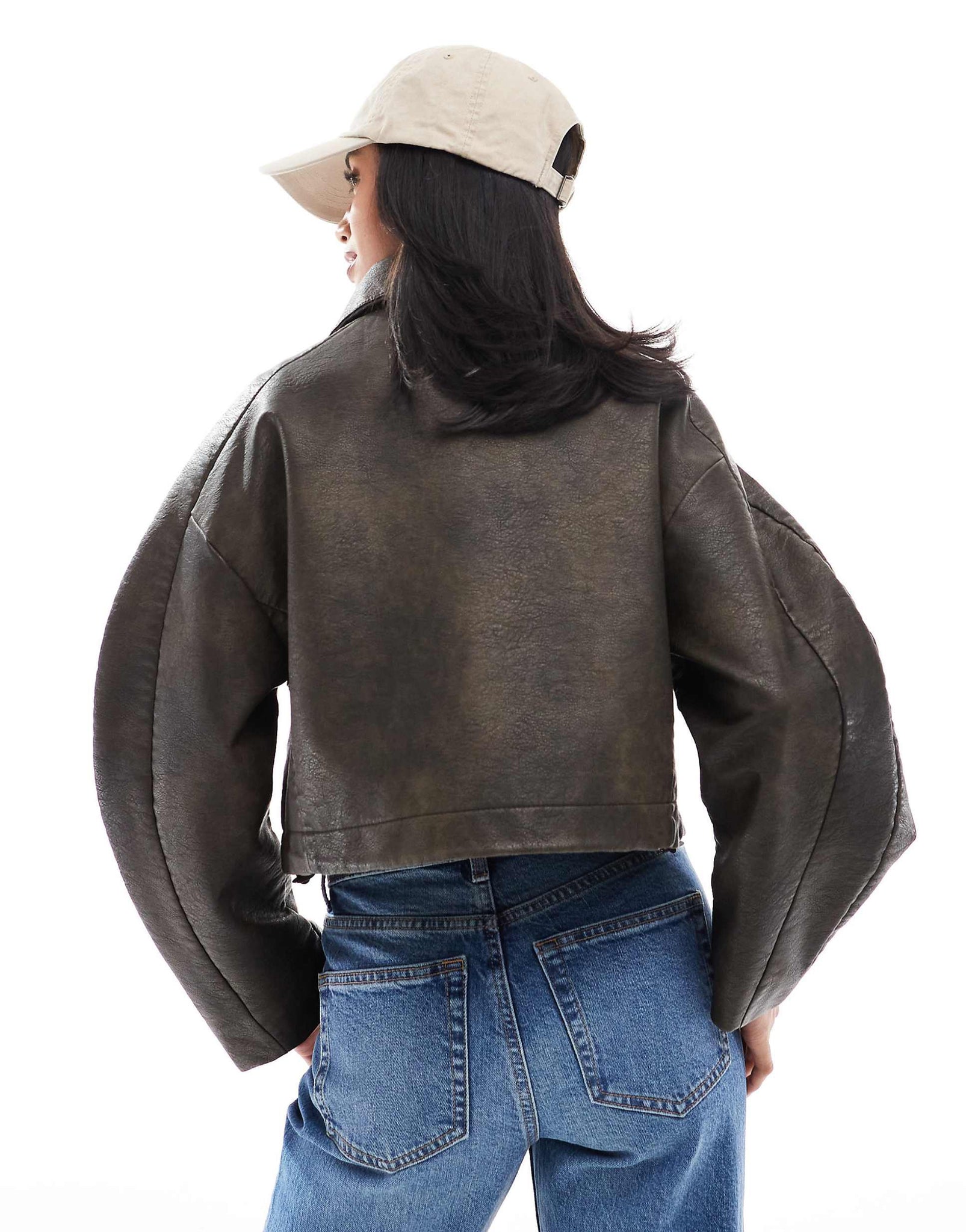 DESIGN Petite funnel neck leather look bomber jacket brown
