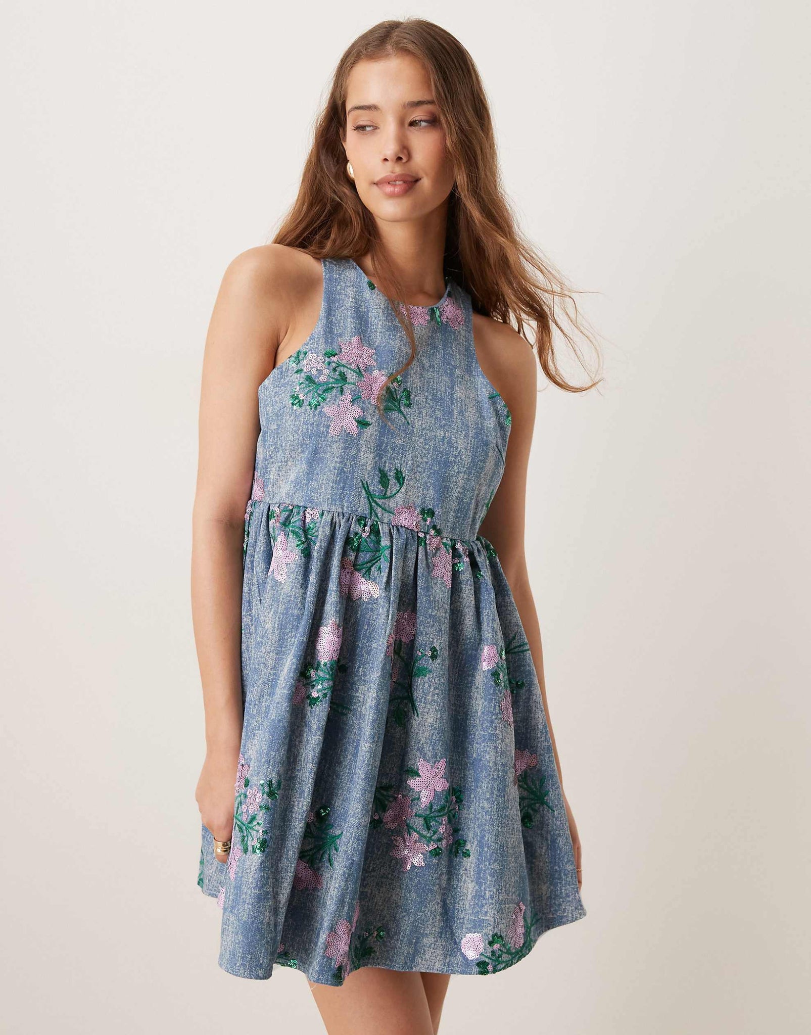 Dream Sister Jane floral embellished smock mini dress denim blue