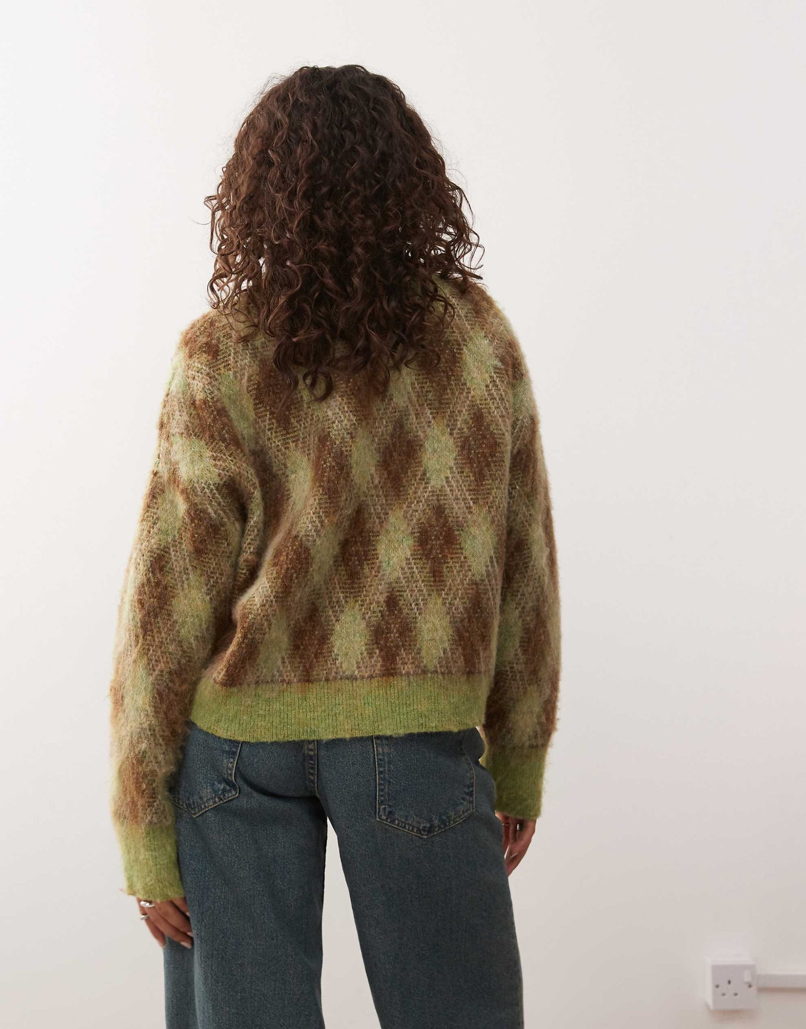 Reclaimed Vintage v-neck brushed knitted jumper brown green argyle pattern